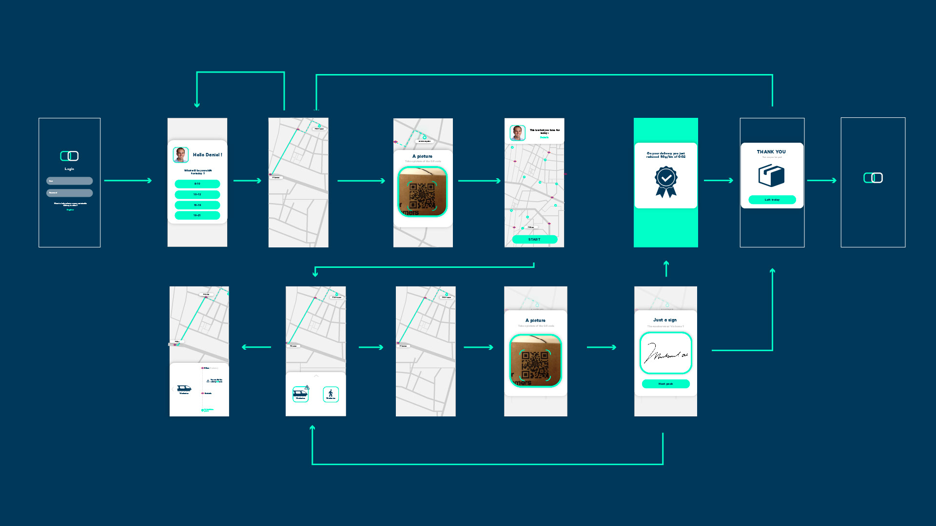 The delivery man, aqn independent worker, picked up as many packages as he wanted, all near the same area, and placed them inside the delivery cart which we designed with the purpose of being used in the subways. This way we avoid traffic in the streets, and we use a public service already available.